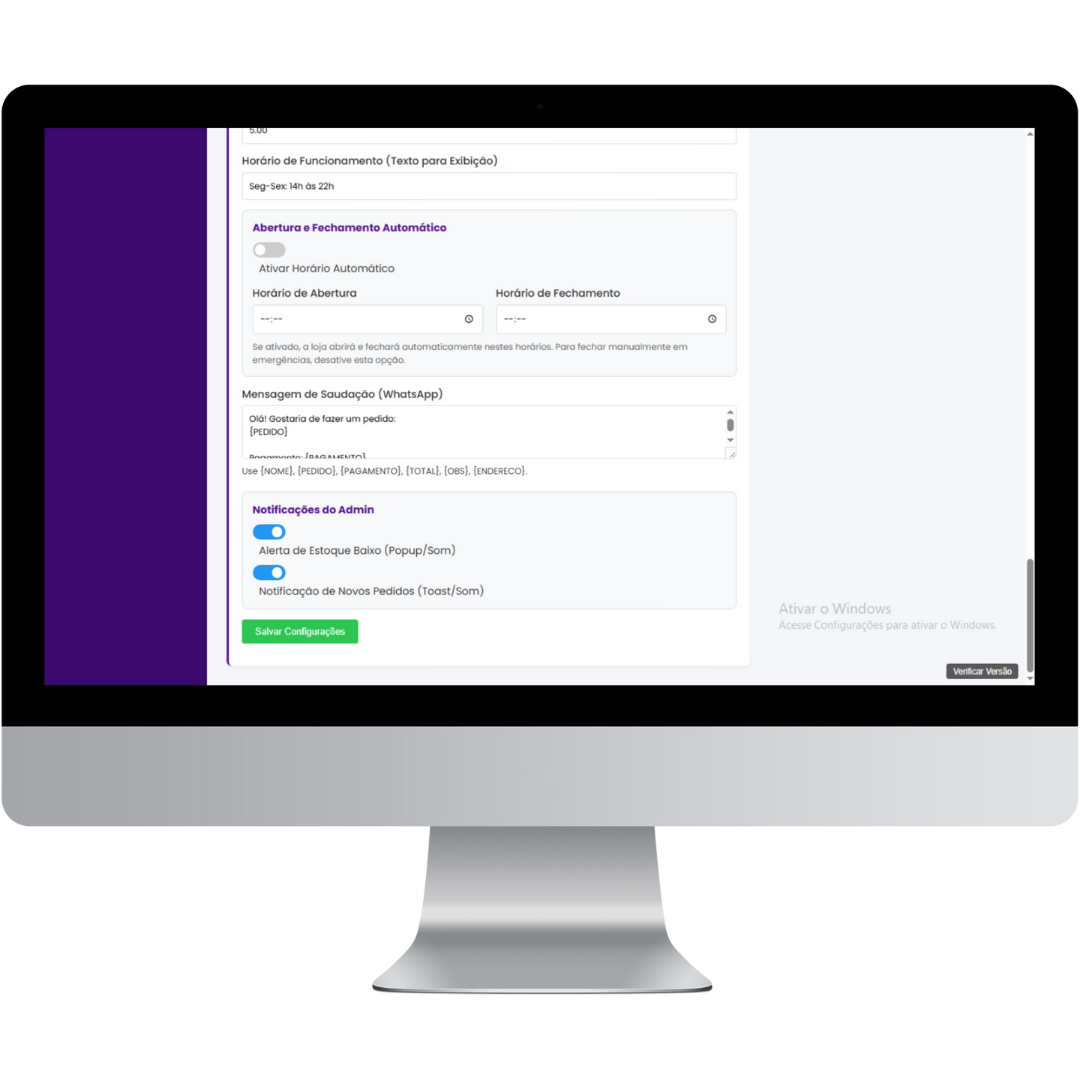 – Configuração de horário de abertura e fechamento automático da loja.